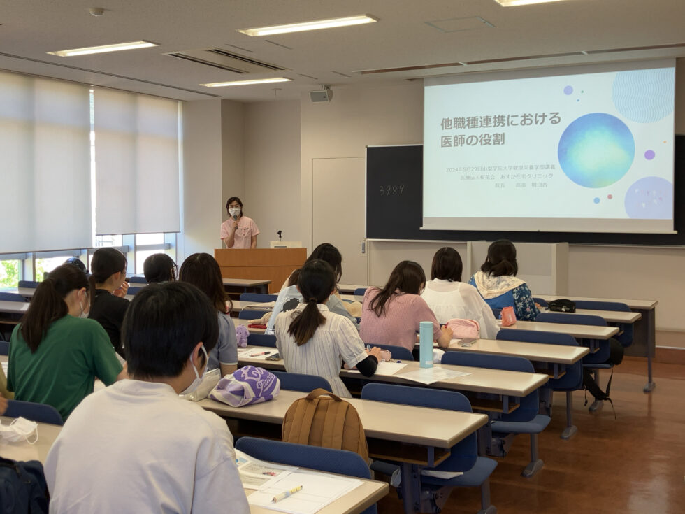 2024.05.29 活動報告 山梨学院短期大学 食物栄養科で講義を行いました 2024年5月29日 山梨学院短期大学にて将来栄養士を目指す学生に講義を行いました。 在宅医療・介護の現場では居宅療養管理指導を用いた訪問栄養食事指導が注目されています。 食の健康と心の健康。栄養士に期待すること。患者様の願いを叶えるためにどのように他職種連携を図っていくかという講義内容に学生達が熱心に聞き、質問する姿に心強さを感じました。 チーム医療の大切さを共有する貴重な時間となりました。 記:医療ソーシャルワーカー 小林 一覧に戻る