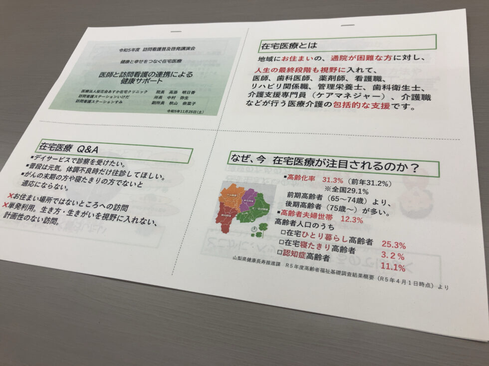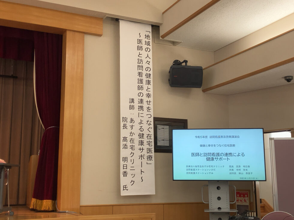 2023年11月25日(土) 山梨県・公益社団法人山梨県看護協会 山梨県訪問看護支援センターが主催する訪問看護普及啓発講演会にて「 地域の人々の健康と幸せをつなぐ在宅医療」~医師と訪問看護の連携による健康サポート~を題材に高添院長が講演を行いました。